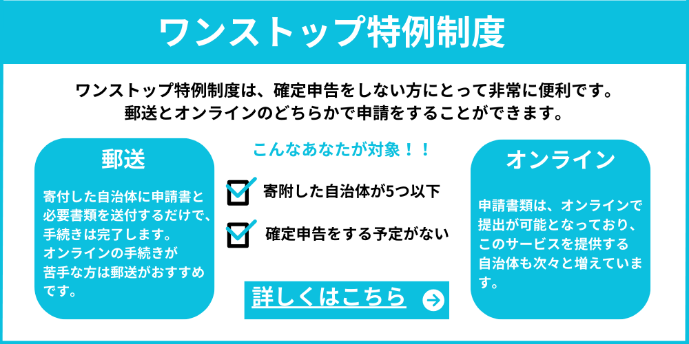 - ワンストップ特例制度を利用すれば、確定申告を行わずに控除を受けることが可能です(一定の条件下)。